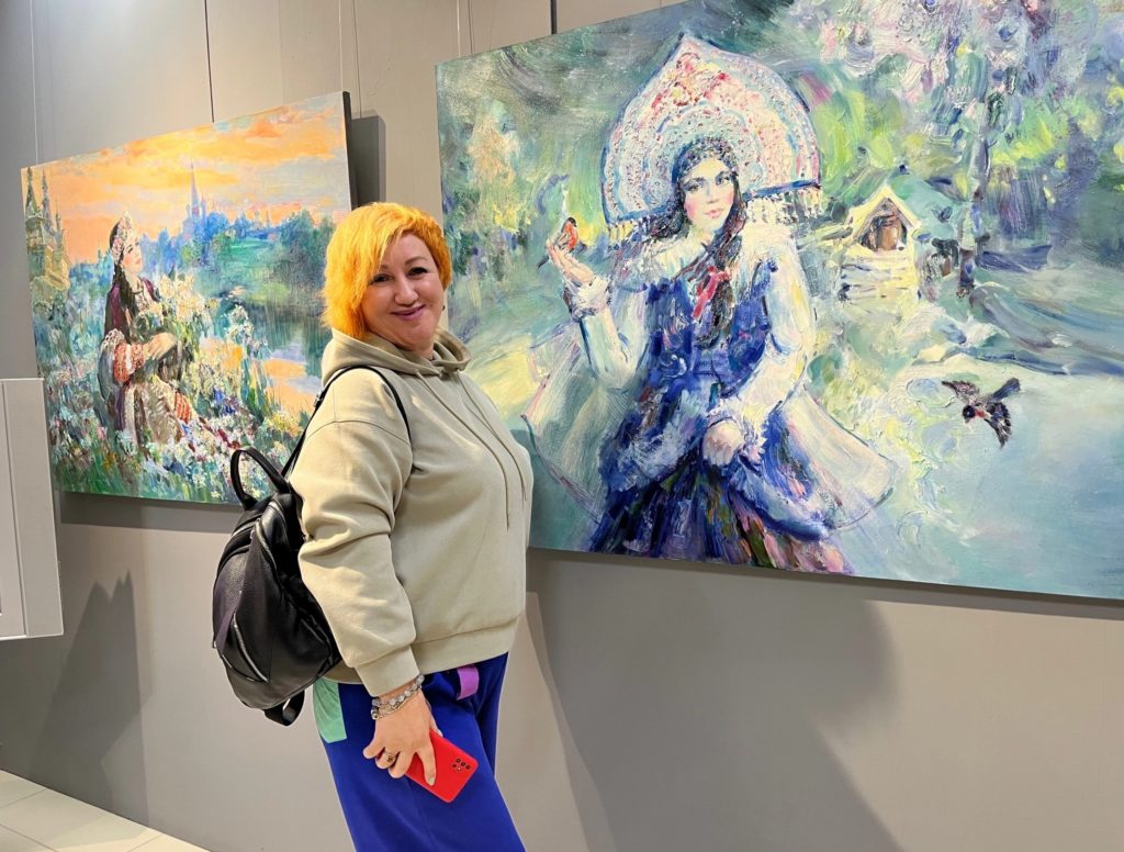 Вторая выставка – “Любимые жанры” художника из Муравленко Андрея Беляева. Первую экскурсию для гостей провел сам автор, он рассказал о каждой работе. Посетители увидели картины, выполненные в жанре портрета, пейзажа, натюморта, книжной иллюстрации. Восторг посетителей вызвали панно из бересты, которые мастер создал по мифологическим сюжета.