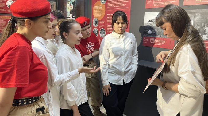 На первой интерактивной экскурсии ребята-юмармейцы из школы № 8 увидели самодельные и фабричные ученические принадлежности военных лет, предметы, связанные с начальной военной подготовкой: учебник 1941 года, фрагмент детского противогаза, подлинные нагрудные знаки пионеров и школьников за овладение оборонными знаниями. А еще узнали, каким навыкам обучали их ровесников в 1940-е годы, изучили военно-топографические знаки, с их помощью прочитали военную карту и решили ряд занимательных задач и головоломок из детских журналов и сборников.