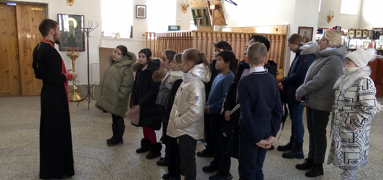 Познавательная экскурсия продолжилась в храме Преображения Господня. Отец Павел рассказал школьникам об истории храма, его внутреннем устройстве и убранстве, особо почитаемых иконах, Священных Писаниях и церковных принадлежностях.
