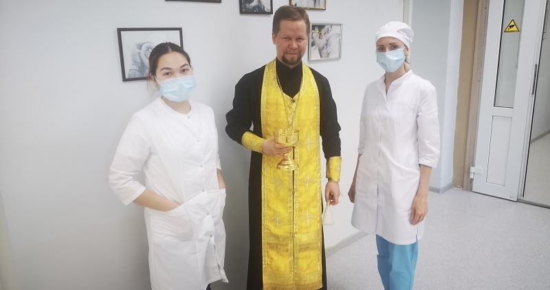 В среду, 27 марта, после молебна в храме-часовне в честь святителя Луки Крымского, в Салехардской окружной клинической больнице иерей Сергий Кузнецов совершил окропление святой водой всего корпуса перинатального отделения.