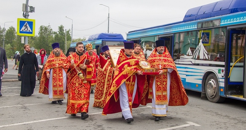 После богослужения духовенство совершили молебен в храме, а затем отправились в автобусный крестный ход с мощами и иконой великомученика Георгия Победоносца по улицам Салехарда. К этому благому действию присоединились многие прихожане и гости окружной столицы.