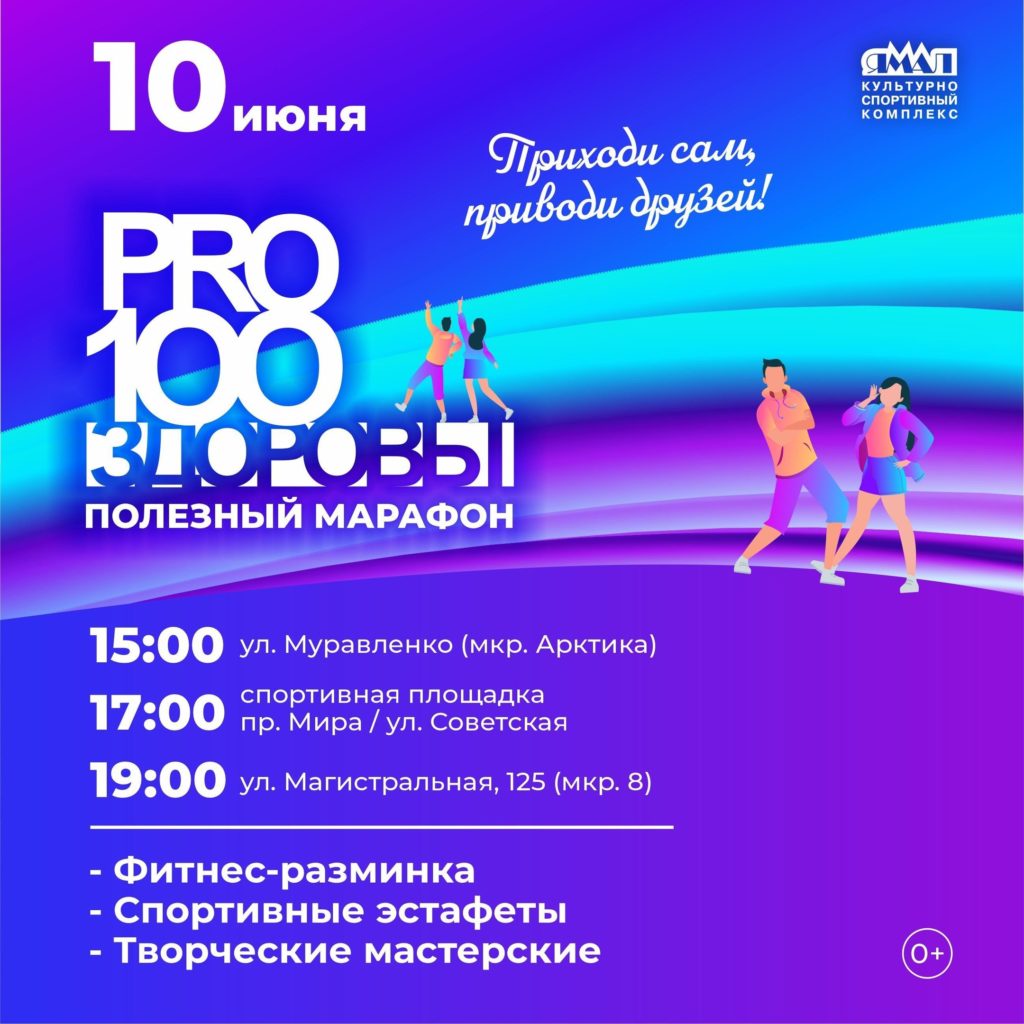 Спортивные разминки, веселые игры, творческие мастерские на свежем воздухе — такие разнообразные активности ждут участников полезного марафона «PRO100здоровы». Он пройдет 10 июня на многофункциональных площадках, расположенных на улице Муравленко, проспекте Мира и в восьмом микрорайоне города.