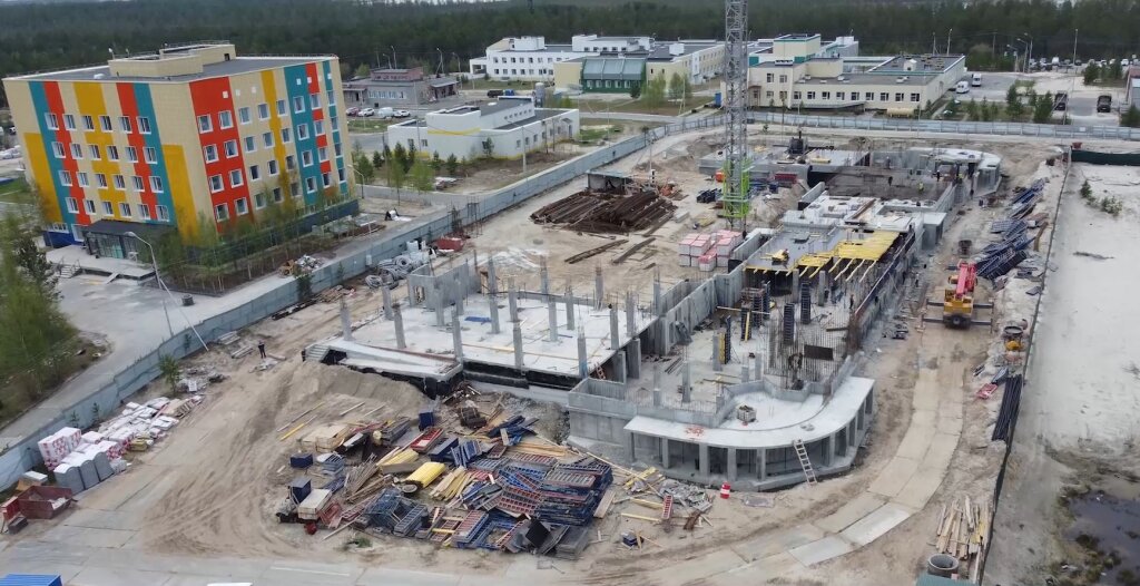 В Муравленко активно строится новая современная поликлиника. Сейчас на объекте ведутся работы по армированию и бетонированию плиты перекрытия над подземным гаражом.