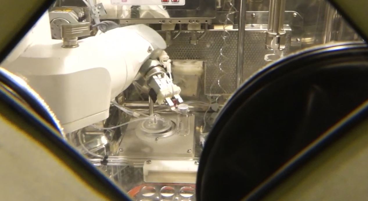 Рука-робот фасует уже готовый препарат. Его производство начинается в 4 утра. Здесь - в циклотроне. В нем вырабатывается радионуклиид. Он по закрытой системе поступает в производственный блок, где происходит синтез.
