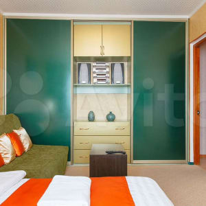 ✔ В гостиной установлена двуспальная кровать с ортопедическим матрасом. Есть раскладной удобный диван, вместительный шкаф-купе. Атмосферу комфорта дополняют журнальный стол, светильник, музыкальный центр. Плотные портьеры обеспечат качество сна.